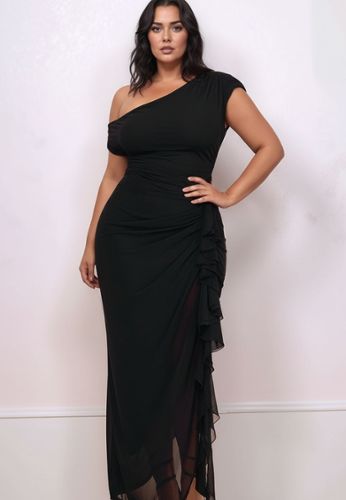 Entdecken Sie dieses asymmetrische Kleid aus schwarzem Voile, das die Kunst der modernen Eleganz revolutioniert! Die entblößte Schulter und das Spiel mit Transparenzen sorgen für einen dramatischen Effekt.