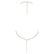 Zuerst die Neckholder-Kette schließen, dann die Rückenkette so einstellen, dass das Top flach anliegt. Pur auf der Haut für maximalen Effekt oder über Bademode/enge Outfits für einen Fashion-Look tragen.