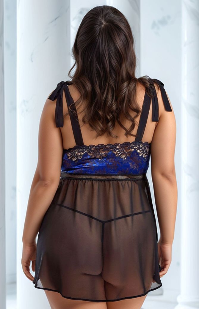 Ein Babydoll aus Chiffon und Spitze mit passendem String. Mieder aus zarter Königsblau-Spitze mit schwarzer Akzentuierung. Elastisches Gewebe bietet Halt ohne Stäbe. Breite Träger zart verstellbar auf den Schultern. Rock aus hochwertigem Chiffon, weich und elastisch. Geeignet für alle Brustgrößen.