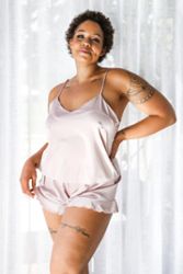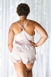 Das Top aus satiniertem Stoff hat schmale, verstellbare Träger und einen Shorty mit elastischem Bund.