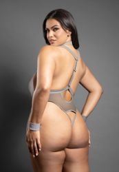 Vorsichtig anziehen und den Teddy glätten, sodass das tiefe Dekolleté sauber sitzt. Das Halsband-Detail mit Kettengliedern flach platzieren. Die abnehmbaren Handschellen hinzufügen für einen spielerischeren Vibe oder weglassen für einen einfacheren Look.