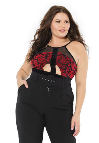 Sinnlichkeit und Komfort kombiniert in einem zweiteiligen Set in großer Größe. Kombination aus glänzendem Wet Look Stoff und transparentem Voile. Mesh Detail unter der Brust und kreuzweise Ösen an den Seiten für einen gewagten Akzent.