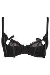Der verspielte schwarze Sevilla-BH besteht aus einer Halbschale, die die Brust aufrichtet und mit gerafftem Tüll und kleinen Rüschen bedeckt ist.