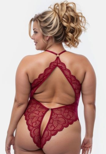 Entdecken Sie diesen zeitgemäßen Body aus wellenförmiger Spitze, der Ihre üppigen Kurven mit seinem gewagten tiefen Ausschnitt und dem sinnlichen offenen Rücken hervorhebt.