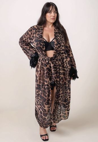 Bringen Sie Ihre wilde Seite zum Ausdruck! Langer Kimono im Leopardenmuster aus leichtem Chiffon, mit Federn verziert und gegürtet für einen glamourösen und unwiderstehlichen Look