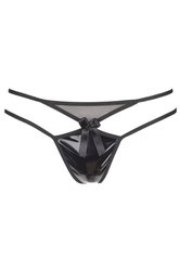 Er ist aus einem luxuriösen Stoff in Vinyl-Optik gefertigt (aber dehnbar und bequem) und ist unten am Bauch in zwei Dreiecke geschnitten, die durch einen Riemen auf der Rückseite des Gesäßes verbunden sind. Verziert mit einer hübschen Schleife.