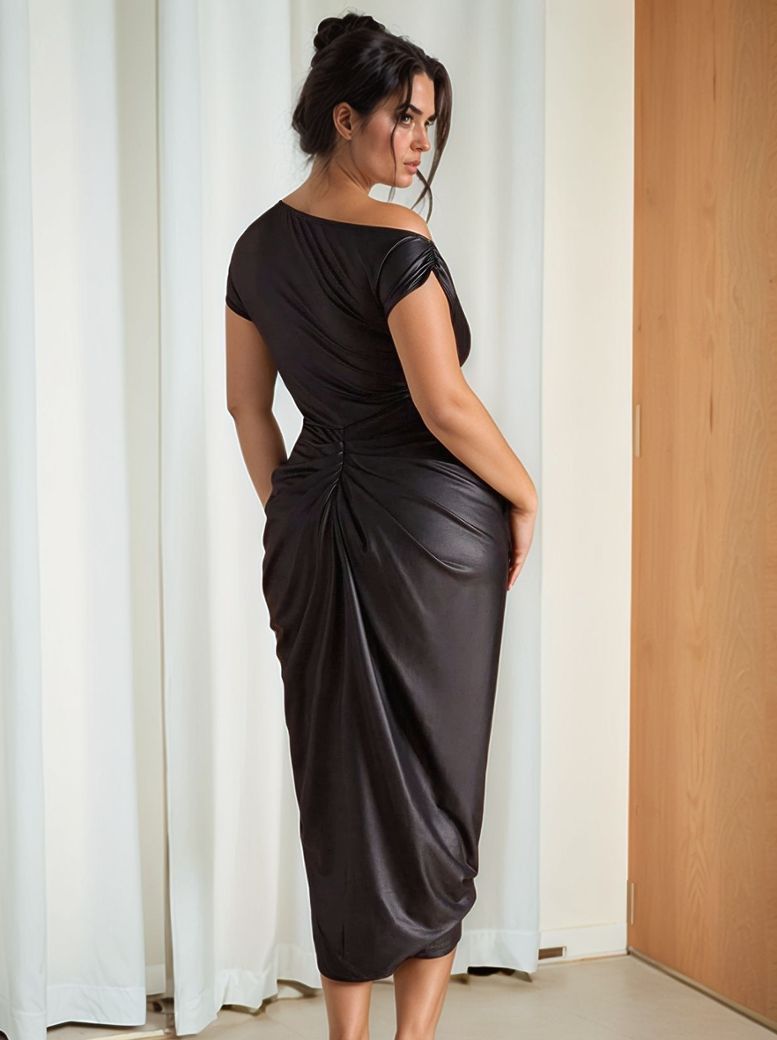 Ein kurzes schwarzes eng anliegendes Kleid aus elastischem Kunstleder schöner Qualität. Stück schlicht und sinnlich, das die Körperkurven folgt und betont, für eine sublime Silhouette und unwiderstehliche Ausstrahlung.