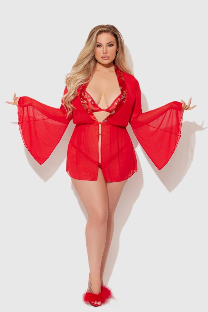 Das dreiteilige Dragon Kimono Set verwandelt Sie in eine Kaiserin mit einem transparenten Kimono aus Maschenware mit fließenden Ärmeln, einem Triangel-BH und einem String aus Satin-Jacquard mit Drachenmotiv.