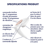 Dieser köstliche Druck wird auch auf den G-Punkt der Partnerin ausgeübt, deren Klitoris gleichzeitig durch den äußeren Teil des Vibrators mit schwindelerregenden Druckwellen stimuliert wird. Genießen Sie leidenschaftliche Momente zu zweit und nie dagewesene Orgasmen dank dieses Vibrators, der Sie in den siebten Himmel steigen lässt.