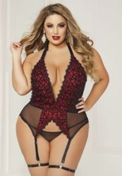 Ζώνη με τιράντες από λεπτό μαύρο δίχτυ και μπορντό ματ σατέν που καλύπτεται από πλούσια δαντέλα.