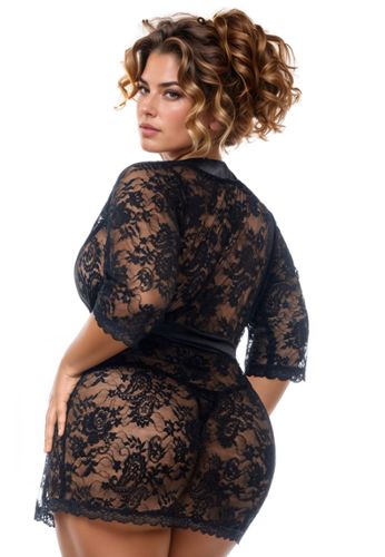 Τυλίξτε τον εαυτό σας σε μυστήριο με αυτό το μακρύ κιμονό από μαύρη δαντέλα που αναδεικνύει κάθε φιγούρα. Η λεπτή φλοράλ δαντέλα του αποκαλύπτει διακριτικά το δέρμα σας μέσα από ένα διάφανο πέπλο που κοσμείται με εκλεπτυσμένα μοτίβα.