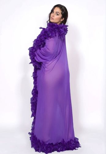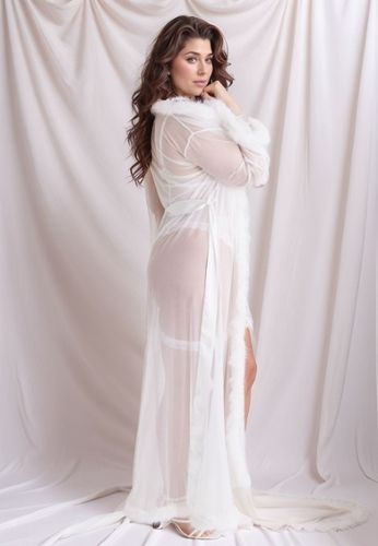 Αυτό το μακρύ, διάφανο κιμονό αναδεικνύει τις καμπύλες σας με κομψότητα, χάρη στο λεπτό γούνινο τελείωμα και τη ζώνη που δένει.