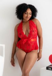 Με δαντέλα και voile στους γοφούς, αυτό το plus-size κορμάκι είναι τόσο γοητευτικό όσο και σέξι.