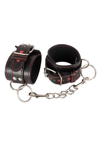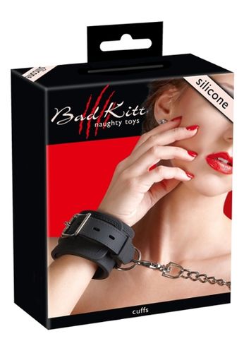 Klaar voor een vreselijk spannende bondagesessie met haar zwarte imitatieleren handboeien.