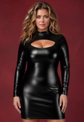 A body-hugging black wetlook mini dress with a sleek shine, a high neck and a daring keyhole cut-out. It smooths the silhouette and turns every step into a spotlight moment.