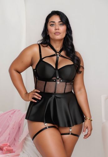 Reveal your daring side with this unique babydoll in faux leather and mesh. A sexy ensemble that celebrates your curves with elegance and provocation.