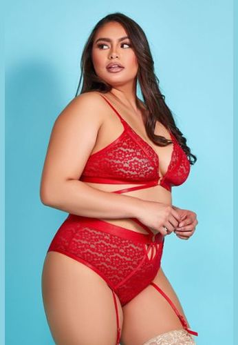 Show off your curves with glamour and originality: the Tentation 2 set is a little masterpiece. The bra is wire-free, yet supportive thanks to an underbust band that meets a gold ring. Straps criss-cross and connect to the ring on the high-waist briefs, incredibly flattering, finished with adjustable garters (removable). And to top it off: open at the crotch and back — just enough to turn up the heat.