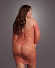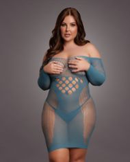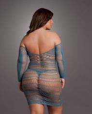 Focus on the play of textures between openwork bodystocking and slightly opaque knit.