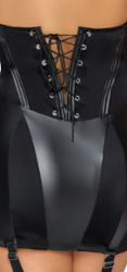 It incorporates a waist cincher with back lacing, and adjustable, detachable garters.