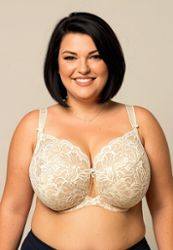 An ecru semi-soft bra in FB cut, designed for large and very plus size busts. The higher gore is ideal for medium necklines. It centres the breasts so they stay within the body’s contour, lifts and creates a rounded shape with a subtle peak. The top of the cups is made of elastic lace with an extra layer of elastic tulle, so it adapts smoothly to the breast shape, even with asymmetry.