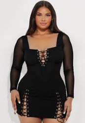 The Little Black Ribbed Dress : ribbed fabric hugging your curves, deep square neckline, transparent mesh sleeves, lacing on chest and thighs. Short, stretchy, hyper sexy. The ultimate seduction dress.