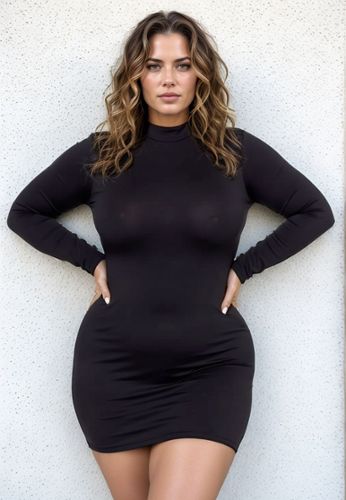 Een zwarte corrigerende jurk met een ultra vrouwelijke look: een diepe V-hals die sleutelbeenderen en halslijn benadrukt, een dubbellaagse borst met uitneembare pads tegen doorschijnen, en een strakker gebreide zone bij taille en buik voor een gladmakend effect. De hoge rug helpt visueel te egaliseren, en de asymmetrische volantzoom geeft een romantische touch.