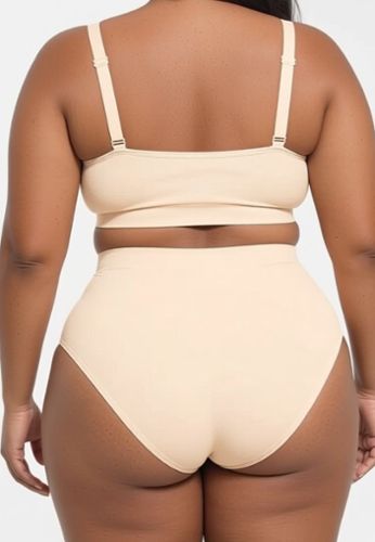 A cream high-waist seamless brief designed for everyday comfort: soft shaping with light tummy control, ultra stretchy yarns and a skin-friendly feel. It features an antibacterial crotch, full coverage, and extra gathered fabric at the back to create a naturally peachy hip look.