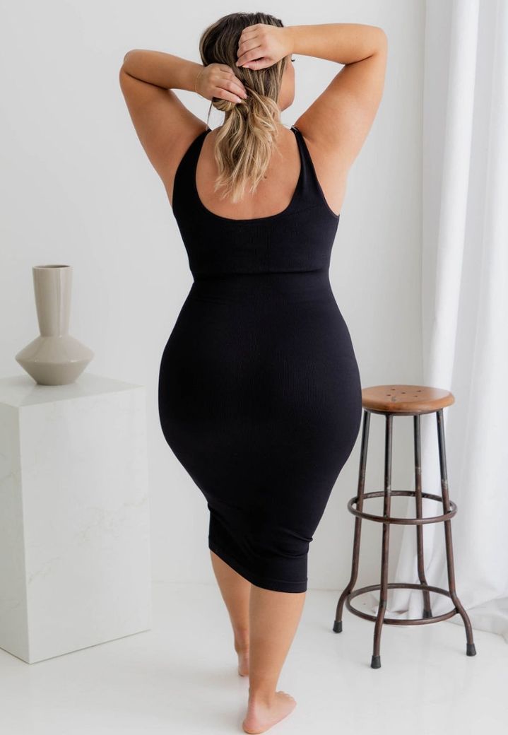 Een zwarte corrigerende jurk met een ultra vrouwelijke look: een diepe V-hals die sleutelbeenderen en halslijn benadrukt, een dubbellaagse borst met uitneembare pads tegen doorschijnen, en een strakker gebreide zone bij taille en buik voor een gladmakend effect. De hoge rug helpt visueel te egaliseren, en de asymmetrische volantzoom geeft een romantische touch.