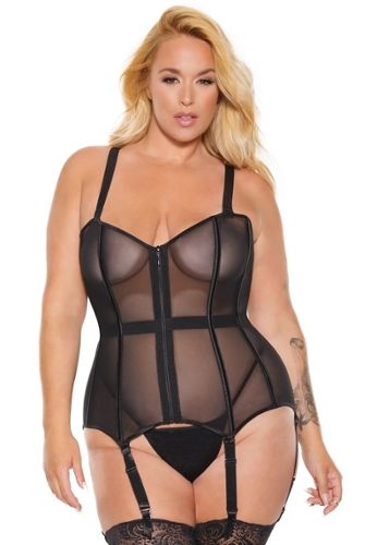 A black mesh bodystocking-style body with a high neck and a row of oval cut-outs down the front for instant wow factor. The mesh hugs your curves, plays with sheer texture, and creates a seriously flattering silhouette—effortlessly.