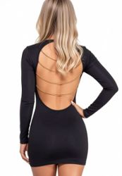 A black tight-fitting mini dress with long sleeves, sleek at the front and exciting at the back. A large open-back cut-out is crossed by 4 gold-coloured chains that are removable, so you can switch up the look. The stand-up collar fastens at the back of the neck with 2 gold-coloured press studs. Soft and stretchy for a very comfortable fit.