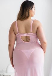 Romantic petal-pink plus-size babydoll with butterfly embroidery, seductive slit and matching thong. elegance and softness guaranteed!