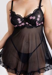 Bajo su exterior romántico, casi recatado, este picardías revela su verdadero temperamento en la espalda, donde se revela provocador y súper sexy. La falda de gasa semitransparente insinúa sutilmente la silueta al tiempo que preserva el misterio.