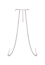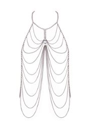 Una body chain plateada que roba miradas: detalles de cadenas con acabado lujoso en el frontal, una gran gema transparente entre el pecho y un cuello halter con cierre mosquetón. Gracias a los ajustes, se adapta a todas las siluetas. Llévela sola como lencería ultra sexy o sobre bañador y looks ceñidos para un glamour irresistible.