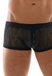 Bóxer ajustado y ultra sexy en encaje fino y transparente que sugiere sin mostrarlo todo. La cintura elástica tejida es cómoda, y la tapeta de botones frontal puede abrirse hasta la entrepierna.