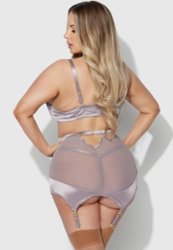 El tanga de rejilla a juego completa el trío, mientras que los tirantes y ligueros ajustables permiten un ajuste personalizado.