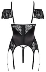 Todo es suave y elástico para que se sienta bien al llevarlo. Los tirantes y las 6 ligas se ajustan para encontrar la caída perfecta, y el doble corchete trasero permite regular el contorno. Las manguitas de encaje también son extraíbles, ideal para pasar de romántico a más atrevido. El tanga abierto a juego remata el conjunto con una cadena de perlas estimulante en la entrepierna, que también se puede retirar.