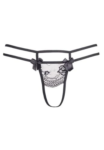 Magnífico tanga de talla grande con entrepierna abierta. Sujetador y liguero a juego de la misma colección.