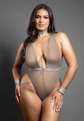Un teddy gris perla para celebrar sus curvas con una energía boudoir muy atrevida: escote profundo, entrepierna abierta, mezcla de polipiel y malla, más un detalle tipo collar con eslabones y esposas desmontables a juego. Elástico, cómodo y diseñado para sentirse segura y sexy.