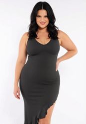 Zwarte corrigerende jurk seamless diepe V-hals asymmetrische volant mouwloos grote maten
