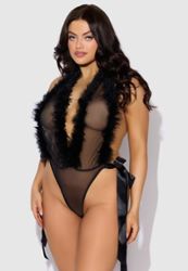 Découvrez votre nouveau coup de cœur avec le body Marilyn Marabou ! Son décolleté plongeant orné de plumes et ses liens halter créent un impact maximal avec une couverture minimale.