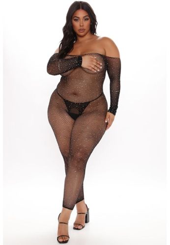 Une coupe élagante qui laisse les épaules à découvert pour cet ensemble grande taille en maille bodystocking semi-transparente.