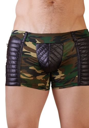 Un pantalon pour homme qui mixe style et sensualité : microfibre douce en motif camouflage, empiècements mats noirs sur les côtés et à l’avant, et bandes avec anneaux pour une touche plus audacieuse. Avec passants de ceinture pour ajuster votre look.