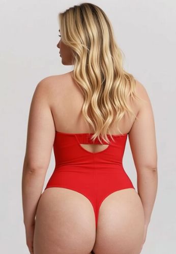 Un body gainant rouge ultra polyvalent : bonnets moulés avec armatures pour le maintien, bande silicone anti-glisse pour le porter sans bretelles, et une double couche qui lisse la taille et le ventre avec une fermeté confortable.