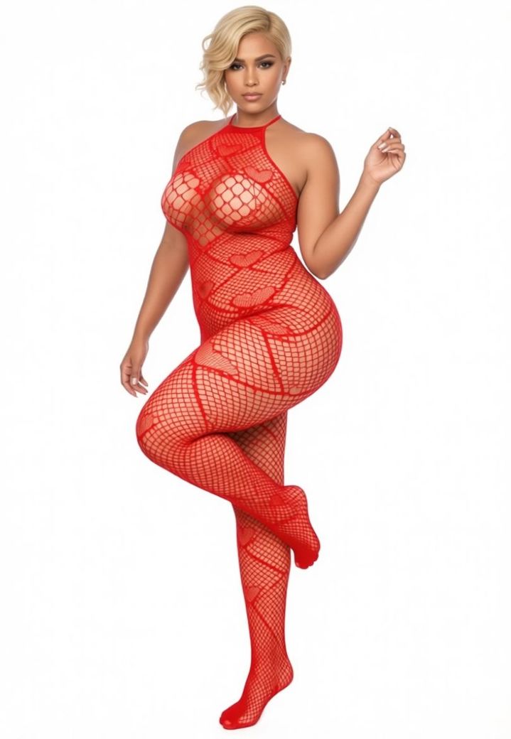 Offrez-vous un mélange de douceur et de caractère avec ce bodystocking en résille rouge transparente à motif cœur, sublimé par des strass scintillants appliqués uniquement sur les cœurs. Son tour de cou met en valeur les épaules avec une élégance sensuelle, tandis que l’ouverture à l’entrejambe affirme son audace.