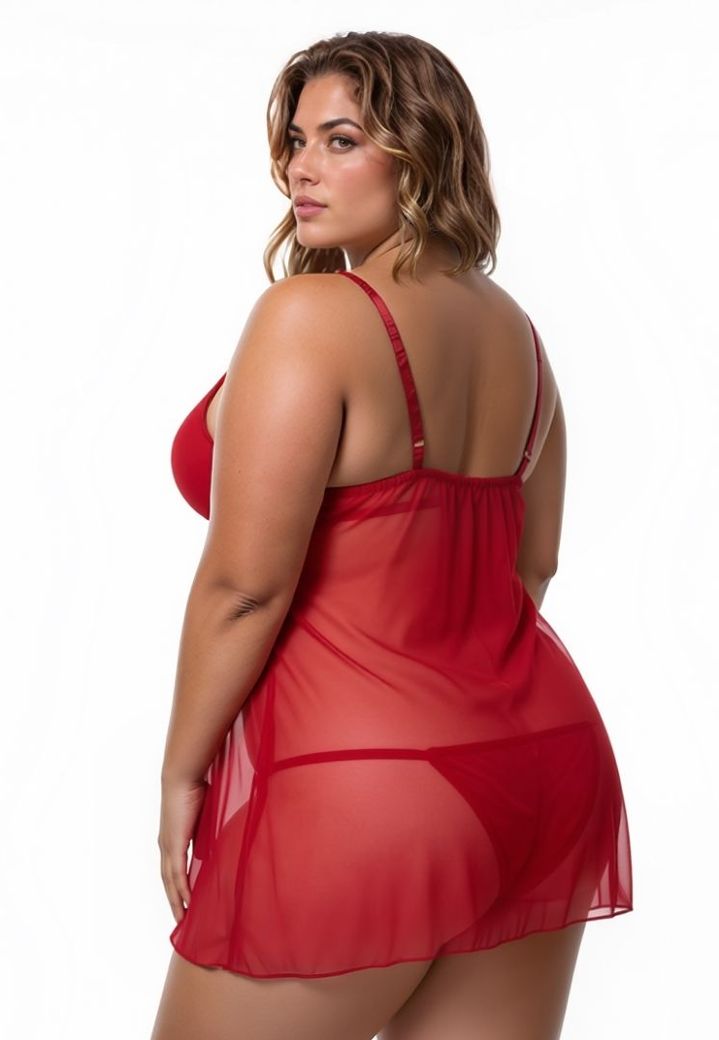 Un babydoll rouge au tombé léger, avec un décolleté en dentelle qui attire l’œil et un petit nœud satiné au centre. Bretelles réglables, string assorti inclus et ajustable sur les hanches.