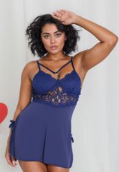 La coupe babydoll épouse vos courbes avec élégance. Les bretelles croisées et le détail bijou apportent une touche de glamour sophistiqué. Disponible en noir intense et bleu royal, cette nuisette s'adapte à toutes les morphologies, en taille standard et grande taille.