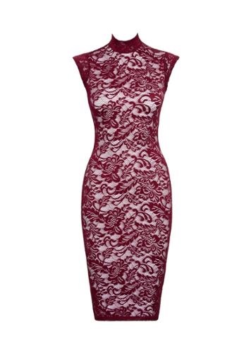 Une robe qui attire le regard dès la première seconde : coupe ajustée, longueur genou, et une dentelle à motif qui habille la silhouette avec élégance. Le col montant se ferme par boutons à la nuque pour une finition très chic.