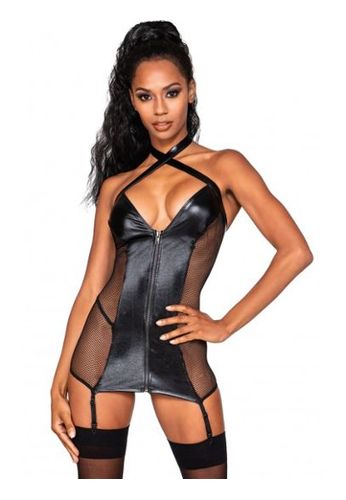 La petite robe noire version boudoir : simili cuir élastique au look ultra sexy, larges bretelles pour une ligne nette, et un intérieur microfibre toute douce qui change tout au confort. Longueur mi-cuisse, agréable à porter, terriblement flatteuse.