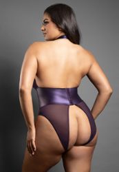 Un teddy violet à la couleur franchement originale, avec col licou, résille et simili cuir, pensé pour une provocation élégante et très érotique. Sa ceinture haute ultra large à laçage attire le regard et sculpte la silhouette, tandis que la coupe ouverte à l’entrejambe et aux fesses fait monter la tension. Le masque assorti complète le jeu.