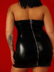 Questo abito in vinile senza spalline con effetto bagnato è un must per il guardaroba fetish di ogni donna.